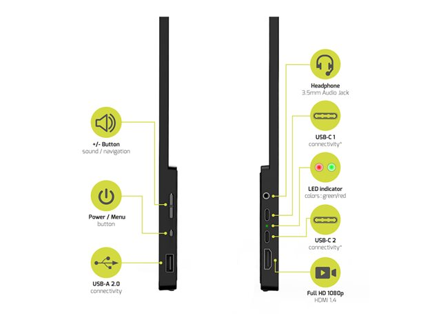 Produktbeskrivning PORT Connect NOMAD - LCD-skärm - Full HD (1080p) - 15.6" - HDR Typ av enhet LCD-skärm - 15.6" - pekskärm Paneltyp IPS Bildförhållande 16:9 Ursprunglig upplösning Full HD (1080p) 1920 x 1080 vid 60 Hz Inmatningsanslutningar HDMI, 2xUSB-C Dimensioner (BxDxH) 35.7 cm x 1.2 cm x 21.5 cm Vikt 590 g Standarder som följs USB Power Delivery, Plug and Play, WEEE, UKCA Tillverkarens garanti 2 års garanti -