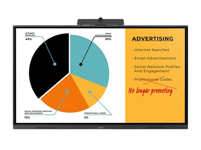 Produktbeskrivning Sharp PN-L652B L2B Series - 65" LED-bakgrundsbelyst LCD-skärm - 4K - för interaktiv kommunikation Typ av produkt LED-bakgrundsbelyst, platt LCD-skärm med pekskärm (multitouch) Diagonalklass 65" Kommersiell användning Ja - interaktiv Plattform Android Upplösning 3840 x 2160 Visningsformat 4K UHD (2160p) Videogränssnitt HDMI HDMI-portskvantitet 3 portar Anknytningsbarhet Wi-Fi, LAN, Bluetooth PC-gränssnitt VGA (HD-15), USB-C Teknik VA LCD-teknik för bakgrundsbelysning Direct LED Bildkvot 16:9 TV-tuner Ingen mottagare Högtalarsystem 2 högtalare Lagringskapacitet 32 GB USB Ja Inkluderade tillbehör Fjärrkontroll, 2 pennor, kabelklämmor Spänning AC 100-240 V (50/60 Hz) Strömkonsumtionsställ med 0.5 Watt Batteri AAA-typ Dimensioner (BxDxH) 148.84 cm x 8.55 cm x 89.66 cm Vikt 36.5 kg Tillverkarens garanti 3 års garanti -