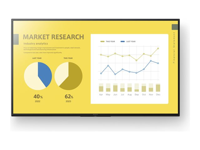 Produktbeskrivning Sony Bravia Professional Displays FW-55EZ20L EZ20L Series - 55" LED-bakgrundsbelyst LCD-skärm - 4K - för digital skyltning Typ av produkt LED-bakgrundsbelyst, platt LCD-skärm URL med QR-kod för energimärke Https://eprel.ec.europa.eu/qr/1589635 Diagonalklass 55" Kommersiell användning Ja - digital skyltning Färg Gagatsvart Plattform Android TV Upplösning 3840 x 2160 Visningsformat 4K UHD (2160p) Ingångsvideoformat 480p, 720p, 1080i, 1080p, 4K UHD (3840 x 2160), DCI 4K (4096 x 2160) HDR-format HDR10 HDR-teknologi Hybrid Log-Gamma (HLG) Rampris och förhöjningsteknologi Motionflow XR-teknologi Videogränssnitt Komposit, HDMI HDMI-portskvantitet 3 portar Anknytningsbarhet Wi-Fi, LAN Teknik IPS LCD-teknik för bakgrundsbelysning Direct LED ramdimning Bildkvot 16:9 TV-tuner Ingen mottagare Kommersiella funktioner HTML5-support, automatisk HDMI-aktivering, BRAVIA Signage Free (BSF) 2.0 Bildförbättringar Live Color, 4K X-Reality PRO Engine, Bred synvinkel, 75 % DCI-P3 färgskala Högtalarsystem 2 högtalare Lagringskapacitet 16 GB USB 2 portar Energiklass Klass G Energiförbrukning vid drift 202 Watt Strömkonsumtion (driftläge) 83 W Strömkonsumtionsställ med 0.5 Watt Dimensioner (BxDxH) - utan ställ 124.3 cm x 7.1 cm x 72.1 cm Vikt 15.3 kg -