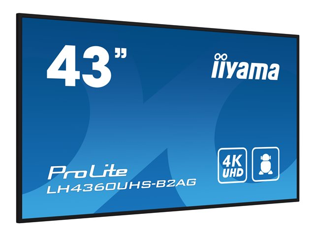 Produktbeskrivning iiyama ProLite LH4360UHS-B2AG 43" Klass (42.5" visbar) LED-bakgrundsbelyst LCD-skärm - 4K - för digital skyltning Typ av produkt LED-bakgrundsbelyst, platt LCD-skärm med inbyggd SoC-mediespelare URL med QR-kod för energimärke Https://eprel.ec.europa.eu/qr/2040349 Diagonalklass 43" Diagonalstorlek 42.5" Kommersiell användning Ja - digital skyltning Färg Svart Plattform Android Upplösning 3840 x 2160 Visningsformat 4K UHD (2160p) Rampris och förhöjningsteknologi 60 Hz Frame Rate Videogränssnitt HDMI HDMI-portskvantitet 3 portar Anknytningsbarhet Wi-Fi, LAN Teknik VA LCD-teknik för bakgrundsbelysning LED-bakgrundsbelysning - kant-LED Bildkvot 16:9 TV-tuner Ingen mottagare Kommersiella funktioner FailOver Bildförbättringar 87 % färgomfång NTSC Högtalarsystem 2 högtalare Lagringskapacitet 16 GB USB 2 portar Inkluderade tillbehör Fjärrkontroll, väggmonteringssats Spänning AC 100-240 V (50/60 Hz) Energiklass Klass E Energiförbrukning vid drift 45 Watt Strömkonsumtionsställ med 0.5 Watt Dimensioner (BxDxH) - utan ställ 96.74 cm x 4 cm x 55.59 cm Vikt 9.1 kg Tillverkarens garanti 3 års garanti -