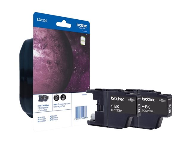 Produktbeskrivning Brother LC1220BKBP2 - 2-pack - svart - original - bläckpatron Typ av produkt Bläckpatron Utskriftsteknik Bläckstråle Utskriftsfärg Svart Avkastning Upp till 300 sidor Medföljande antal 2-pack Förpackningstyp Blister Kompatibel med Brother DCP-J525W, DCP-J725DW, DCP-J925DW, MFC-J825DW; MyMio MFC-J825N -