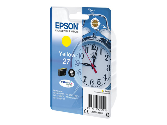 Produktbeskrivning Epson 27 - gul - original - bläckpatron Typ av produkt Bläckpatron Utskriftsteknik Bläckstråle Utskriftsfärg Gul Kapacitet 3.6 ml Egenskaper för tonerkassett Epson DURABrite Ultra Avkastning Upp till 300 sidor Kompatibel med WorkForce WF-3620DWF, WF-3620DWF Stickers, WF-3640DTWF, WF-7110DTW, WF-7210DTW, WF-7610DWF, WF-7620, WF-7620DTWF, WF-7710DWF, WF-7715DWF, WF-7720DTWF -