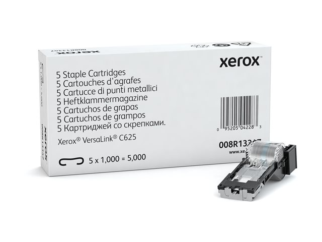 Produktbeskrivning Xerox - 5-pack - 5000 häftklamrar - häftklammermagasin Typ av produkt Häftklammermagasin Bindningskapacitet 5000 häftklamrar Medföljande antal 5-pack Kompatibel med VersaLink B415/DN, B415V_DN, C415/DN, C415V_DN, C625V_DN -