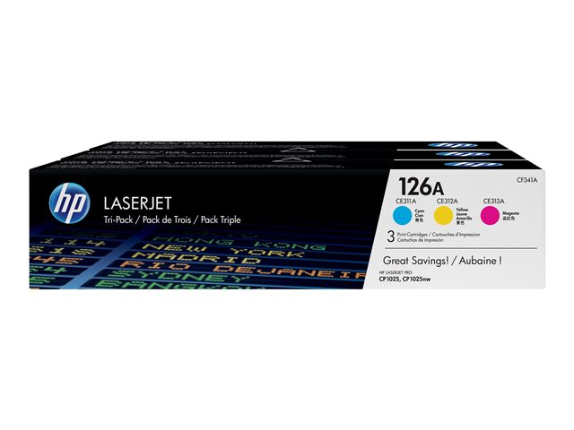 Produktbeskrivning HP 126A - 3-pack - gul, cyan, magenta - original - LaserJet - tonerkassett (CF341A) Typ av produkt Tonerkassett Utskriftsteknik Laser HP-submärke LaserJet Utskriftsfärg Gul, cyan, magenta Egenskaper för tonerkassett HP ColorSphere Avkastning Upp till 1000 sidor ISO/IEC 19798 Medföljande antal 3-pack Kompatibel med Color LaserJet Pro CP1025, CP1025nw; LaserJet Pro MFP M175a, MFP M175nw; TopShot LaserJet Pro M275 MFP -