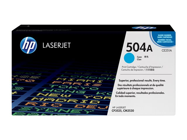 Produktbeskrivning HP 504A - cyan - original - LaserJet - tonerkassett (CE251A) Typ av produkt Tonerkassett Utskriftsteknik Laser HP-submärke LaserJet Utskriftsfärg Cyan Egenskaper för tonerkassett HP ColorSphere/Smart utskrift Avkastning Upp till 7000 sidor ISO/IEC 19798 Återvunnet produktinnehåll 14 % Kompatibel med Color LaserJet CM3530 MFP, CM3530fs MFP, CP3525, CP3525dn, CP3525n, CP3525x -