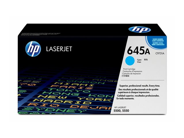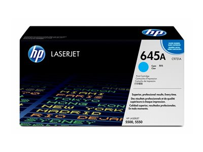 Produktbeskrivning HP 645A - cyan - original - LaserJet - tonerkassett (C9731A) Typ av produkt Tonerkassett Utskriftsteknik Laser HP-submärke LaserJet Utskriftsfärg Cyan Egenskaper för tonerkassett HP Smart Printing Avkastning Upp till 12000 sidor vid 5% täckning Återvunnet produktinnehåll 17 % Kompatibel med Color LaserJet 5500, 5500dn, 5500dtn, 5500hdn, 5500n, 5550, 5550dn, 5550dtn, 5550hdn, 5550n -