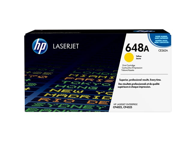 Produktbeskrivning HP 648A - gul - original - LaserJet - tonerkassett (CE262A) Typ av produkt Tonerkassett Utskriftsteknik Laser HP-submärke LaserJet Utskriftsfärg Gul Avkastning Upp till 11000 sidor ISO/IEC 19798 Kompatibel med Color LaserJet Enterprise CP4025dn, CP4025n, CP4525dn, CP4525n, CP4525xh -