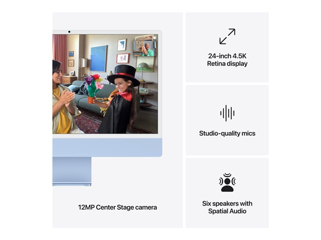 Produktbeskrivning Apple iMac with 4.5K Retina display - allt-i-ett M4 - 24 GB - SSD 512 GB - LED 24" - Svenska/finska Typ PC - allt-i-ett Processor Apple M4 (10-core) Huvudfunktioner för processor Videoavkodningsmotor, maskinvaruaccelererad ray tracing, ProRes kodnings- och avkodningsmotor, AV1-avkodning, 120 GB/s minnesbandbredd, videokodningsmotor, Maskinaccelererad H.264, HEVC, ProRes och ProRes RAW Neural processor enhet (NPU) 16-core Neural Engine RAM 24 GB Hårddisk SSD 512 GB - integrerad Optisk lagring Ingen optisk drivenhet Bildskärm 24" - LED - 4480 x 2520 (4.5K) - 218 ppi Grafikstyrenhet Apple M4 10-core Kamera Ja Digitala ljudstandarder som stöds AAC, MP3, FLAC, Apple Lossless, Dolby Atmos, Dolby Digital, Dolby Digital Plus Digitala videostandarder som stöds H.264, HEVC, ProRes, ProRes RAW, AV1 Ljudutgång Stereo Nätverksfunktioner 1GbE, 802.11a, 802.11b/g/n, Wi-Fi 5, Wi-Fi 6E, Bluetooth 5.3 Tangentbord Svenska/finska Strömtillförsel (50/60 Hz) Medföljande OS Apple macOS Sequoia 15.0 Medföljande programvara Apple iMovie, Apple Safari, Apple GarageBand, Photo Booth, Apple Time Machine, Apple FaceTime, Apple Preview, Post, Kartor, Foton, Påminnelser, App Store, Musik, Kontakter, Aktier, Anteckningar, Väder, Kalender, Siri, Messages, Apple iBooks, Apple Keynote, Apple Pages, Apple Numbers, News, Voice Memos, Podcasts, Home, Apple TV, Find My, Apple Shortcuts, Apple QuickTime Player, Apple Freeform, iPhone spegling Apple Intelligens Ja Färg Blå Dimensioner (BxDxH) 54.7 cm x 14.7 cm x 46.1 cm Vikt 4.44 kg Miljöstandarder ENERGY STAR-godkänd Koldioxidavtryck 391 kg koldioxidutsläpp Sällsynta jordartsmetaller 99 % återvunna sällsynta jordartselement Tillverkarens garanti Begränsad garanti - 1 år