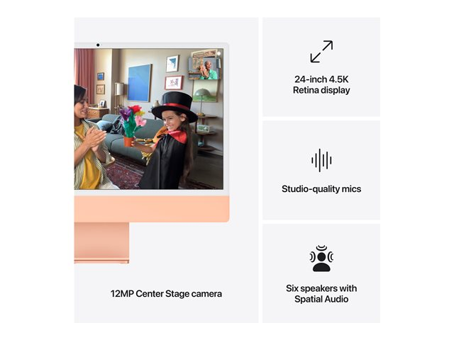 Produktbeskrivning Apple iMac with 4.5K Retina display - allt-i-ett M4 - 24 GB - SSD 512 GB - LED 24" Typ PC - allt-i-ett Processor Apple M4 (10-core) Huvudfunktioner för processor Videoavkodningsmotor, maskinvaruaccelererad ray tracing, ProRes kodnings- och avkodningsmotor, AV1-avkodning, 120 GB/s minnesbandbredd, videokodningsmotor, Maskinaccelererad H.264, HEVC, ProRes och ProRes RAW Neural processor enhet (NPU) 16-core Neural Engine RAM 24 GB Hårddisk SSD 512 GB - integrerad Optisk lagring Ingen optisk drivenhet Bildskärm 24" - LED - 4480 x 2520 (4.5K) - 218 ppi Grafikstyrenhet Apple M4 10-core Kamera Ja Digitala ljudstandarder som stöds AAC, MP3, FLAC, Apple Lossless, Dolby Atmos, Dolby Digital, Dolby Digital Plus Digitala videostandarder som stöds H.264, HEVC, ProRes, ProRes RAW, AV1 Ljudutgång Stereo Nätverksfunktioner 1GbE, 802.11a, 802.11b/g/n, Wi-Fi 5, Wi-Fi 6E, Bluetooth 5.3 Strömtillförsel (50/60 Hz) Medföljande OS Apple macOS Sequoia 15.0 Medföljande programvara Apple iMovie, Apple Safari, Apple GarageBand, Photo Booth, Apple Time Machine, Apple FaceTime, Apple Preview, Post, Kartor, Foton, Påminnelser, App Store, Musik, Kontakter, Aktier, Anteckningar, Väder, Kalender, Siri, Messages, Apple iBooks, Apple Keynote, Apple Pages, Apple Numbers, News, Voice Memos, Podcasts, Home, Apple TV, Find My, Apple Shortcuts, Apple QuickTime Player, Apple Freeform, iPhone spegling Apple Intelligens Ja Färg Orange Dimensioner (BxDxH) 54.7 cm x 14.7 cm x 46.1 cm Vikt 4.44 kg Miljöstandarder ENERGY STAR-godkänd Koldioxidavtryck 391 kg koldioxidutsläpp Sällsynta jordartsmetaller 99 % återvunna sällsynta jordartselement Tillverkarens garanti Begränsad garanti - 1 år