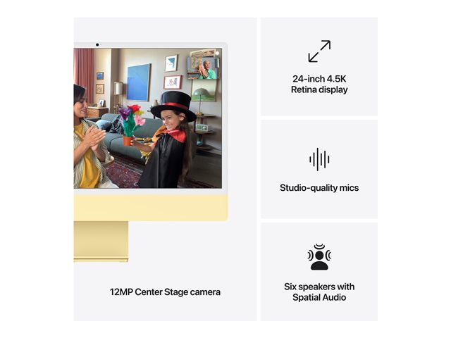 Produktbeskrivning Apple iMac with 4.5K Retina display - allt-i-ett M4 - 16 GB - SSD 256 GB - LED 24" Typ PC - allt-i-ett Processor Apple M4 (10-core) Huvudfunktioner för processor Videoavkodningsmotor, maskinvaruaccelererad ray tracing, ProRes kodnings- och avkodningsmotor, AV1-avkodning, 120 GB/s minnesbandbredd, videokodningsmotor, Maskinaccelererad H.264, HEVC, ProRes och ProRes RAW Neural processor enhet (NPU) 16-core Neural Engine RAM 16 GB Hårddisk SSD 256 GB - integrerad Optisk lagring Ingen optisk drivenhet Bildskärm 24" - LED - 4480 x 2520 (4.5K) - 218 ppi Grafikstyrenhet Apple M4 10-core Kamera Ja Digitala ljudstandarder som stöds AAC, MP3, FLAC, Apple Lossless, Dolby Atmos, Dolby Digital, Dolby Digital Plus Digitala videostandarder som stöds H.264, HEVC, ProRes, ProRes RAW, AV1 Ljudutgång Stereo Nätverksfunktioner 1GbE, 802.11a, 802.11b/g/n, Wi-Fi 5, Wi-Fi 6E, Bluetooth 5.3 Strömtillförsel (50/60 Hz) Medföljande OS Apple macOS Sequoia 15.0 Medföljande programvara Apple iMovie, Apple Safari, Apple GarageBand, Photo Booth, Apple Time Machine, Apple FaceTime, Apple Preview, Post, Kartor, Foton, Påminnelser, App Store, Musik, Kontakter, Aktier, Anteckningar, Väder, Kalender, Siri, Messages, Apple iBooks, Apple Keynote, Apple Pages, Apple Numbers, News, Voice Memos, Podcasts, Home, Apple TV, Find My, Apple Shortcuts, Apple QuickTime Player, Apple Freeform, iPhone spegling Apple Intelligens Ja Färg Gul Dimensioner (BxDxH) 54.7 cm x 14.7 cm x 46.1 cm Vikt 4.44 kg Miljöstandarder ENERGY STAR-godkänd Sällsynta jordartsmetaller 99 % återvunna sällsynta jordartselement Tillverkarens garanti Begränsad garanti - 1 år