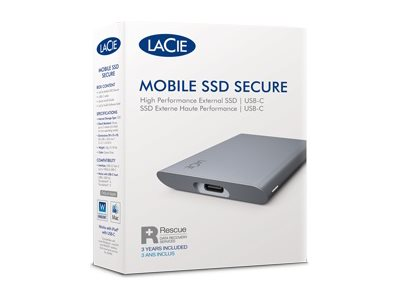 Produktbeskrivning LaCie Mobile Secure STKH1000800 - SSD - High Performance - 1 TB - USB 3.2 Gen 2 Typ SSD-enhet - extern (portabel) Kapacitet 1 TB Maskinvarukryptering Ja Krypteringsalgoritm 256 bitars AES Gränssnitt USB 3.2 Gen 2 - USB-C Dataöverföringshastighet 10,0 GB (USB 3.2 Gen2) Drivenhetsklass High Performance Egenskaper Stöttålig Strömkälla USB-buss Färg Rymdgrå Dimensioner (BxDxH) 78.36 mm x 98.36 mm x 9 mm Vikt 45 g Lokalisering Världsomspännande Tillverkarens garanti 3 års garanti Kombinerad med 3 års Seagate Rescue Data Recovery -