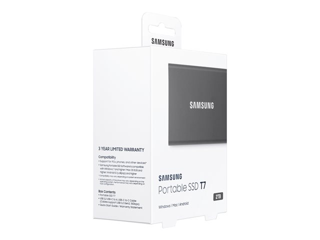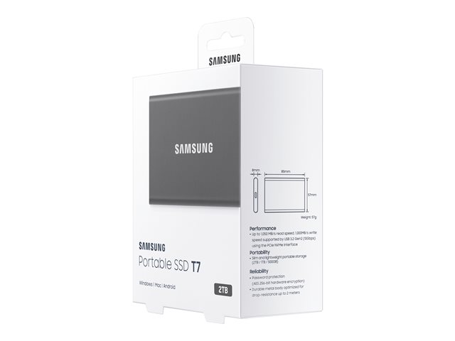 Produktbeskrivning Samsung T7 MU-PC2T0T - SSD - 2 TB - USB 3.2 Gen 2 Typ SSD-enhet - extern (portabel) Kapacitet 2 TB Maskinvarukryptering Ja Krypteringsalgoritm 256 bitars AES Gränssnitt USB 3.2 Gen 2 - USB-C Dataöverföringshastighet 10,0 GB (USB 3.2 Gen2) Egenskaper Dynamic Thermal Guard protection, stöttålig, validering av lösenord, NVM Express (NVMe), 256 bitars AES Strömkälla USB-buss Färg Titan gray Dimensioner (BxDxH) 85 mm x 8 mm x 57 mm Vikt 58 g Tillverkarens garanti 3 års garanti -