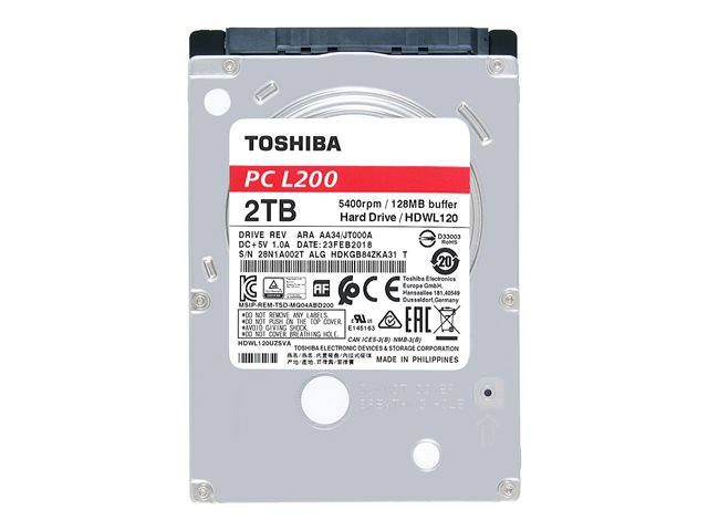Produktbeskrivning Toshiba L200 Laptop PC - hårddisk - 2 TB - SATA 6Gb/s Typ Hårddisk - inbyggd Kapacitet 2 TB Formfaktor 2.5" Gränssnitt SATA 6Gb/s Dataöverföringshastighet 600 MBps Buffertstorlek 128 MB Spindelhastighet 5400 rpm Egenskaper Stötsensor, Native Command Queuing (NCQ), Advanced Format-teknik Dimensioner (BxDxH) 69.85 mm x 100 mm x 9.5 mm Vikt 117 g Tillverkarens garanti 3 års garanti -