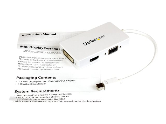 Produktbeskrivning StarTech.com Travel A/V Adapter: 3-in-1 Mini DisplayPort to VGA DVI or HDMI Converter - White (MDP2VGDVHDW) - videokonverterare - vit Typ av enhet Videokonverterare Max upplösning 1920 x 1200 Gränssnitt 1 x DisplayPort-ingång - Mini DisplayPort