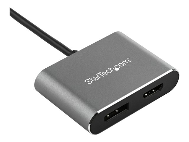 Produktbeskrivning StarTech.com USB-C multiportvideoadapter - HDMI eller DisplayPort - 4K 60 Hz - videokort - DisplayPort / HDMI - 20.5 cm Kabel Videokort - DisplayPort / HDMI Max effektupplösning 3840 x 2160 - 60 Hz Kabellängd 20.5 cm Färg Rymdgrå Kontakter 24 pin USB-C - hane (ingång) Kontakter (andra änden) HDMI - hona (utgång)