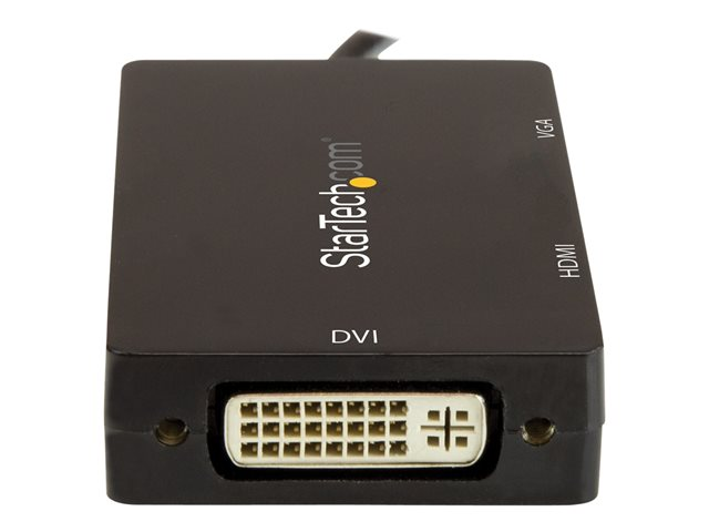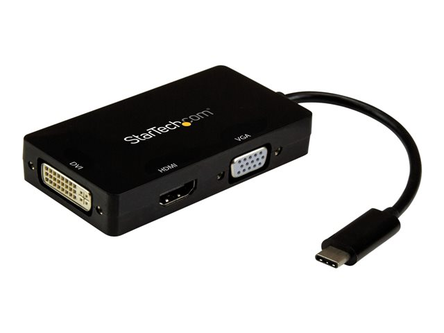 Produktbeskrivning StarTech.com USB-C-videoadapter med flera portar - 3-i-1 - 4K 30Hz - svart - videokort - HDMI / DVI / VGA / USB - 15 cm Kabel Videokort - HDMI / DVI / VGA / USB Max effektupplösning 3840 x 2160 - 30 Hz Kabellängd 15 cm Färg Svart Kontakter USB-C - hane (ingång) Kontakter (andra änden) HDMI - hona (utgång)