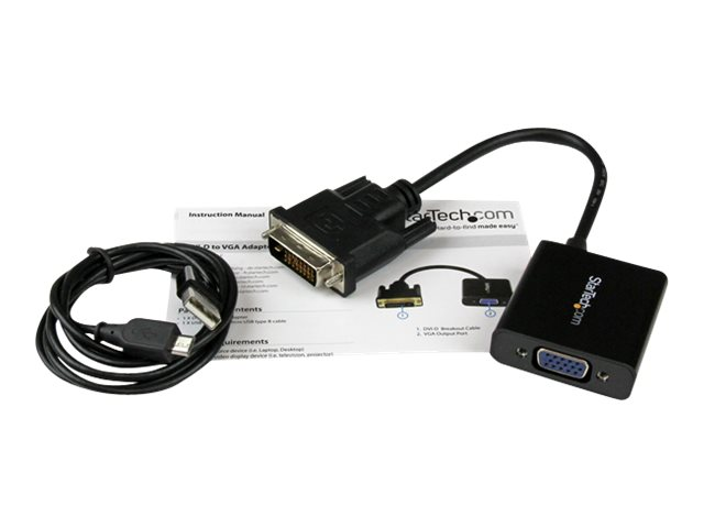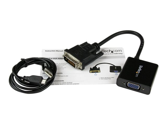 Produktbeskrivning StarTech.com Aktiv DVI-D till VGA-kabeladapter - 1920x1200 - videokort - 24.8 m Typ Videokort Egenskaper Aktiv adapter, 1920 x 1200 (WUXGA) stöd Kabellängd 24.8 m Kontakter 24+1 pin digital DVI - hane