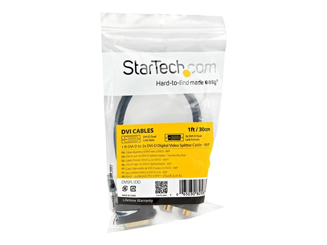 Produktbeskrivning StarTech.com 30 cm DVI-D till 2x DVI-D digital video splitter kabel ? M/F - linjedelare för video - DVI - 30.5 cm Kabel Linjedelare för video - DVI Teknik Skärmad TMDS-länkar Dubbel länk Kabellängd 30.5 cm Färg Svart Kontaktdon 2 x DVI-D - hona Kontakt (andra änden) DVI-D - hane Tillverkarens garanti Begränsad livstidsgaranti Designat för P/N: DVIDDMM1, DVIDDMM10M, DVIDDMM25, DVIDDMM2M, DVIDDMM3M, DVIDDMM5M -