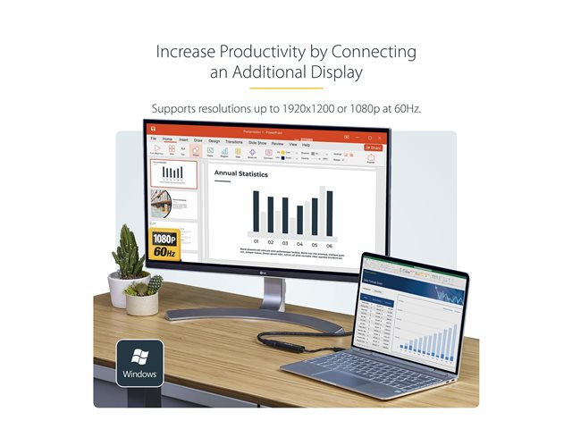1080p (1920x1200) - Tunn/kompakt USB Type-A till HDMI-skärmadapterkonverterare - Externt video- och grafikkort - Svart - Endast Windows - Adapterkabel - TAA-kompatibel - USB typ A hane till HDMI hona - 19 cm - svart - stöd för 1080p - för P/N: HDDVIMM3, HDMM12, HDMM15, HDMM1MP, HDMM2MP, HDMM3, HDMM3MP, HDMM50A, HDMM6, HDPMM50
