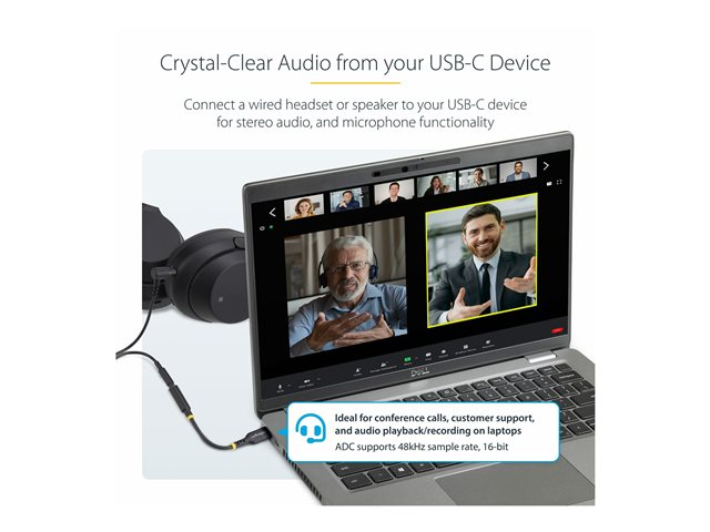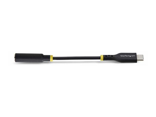 Produktbeskrivning StarTech.com USB-C Audio Adapter to 3.5mm TRRS Jack, Headphone Aux Dongle - USB-C till uttagsadapter för hörlurar - 12.7 cm Kabel USB-C till uttagsadapter för hörlurar Kabellängd 12.7 cm Färg Svart Kontaktdon USB-C - hane Kontakt (andra änden) 4-poligt minijack - hona Standarder som följs USB / USB 2.0 DAC Ja DAC-information 44.1 - 384 kHz - SNR: 105 dB Egenskaper 32-bitars DAC, Realtek ALC4030U chipset Tillverkarens garanti 2 års garanti -