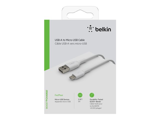Produktbeskrivning Belkin BoostCharge - USB-kabel - mikro-USB typ B till USB - 1 m Typ USB-kabel Egenskaper Synkronisering och laddning Kabellängd 1 m Kontaktdon 5-stifts mikro-USB typ B - hane Kontakt (andra änden) 4-stifts USB typ A - hane Färg Vit -