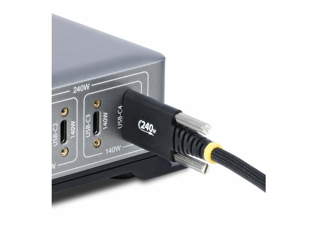 Produktbeskrivning StarTech.com 10ft (3m) USB-C Charging Cable, 240W, Silicone Jacket - USB typ C-kabel - USB-C till USB-C - 3 m Typ USB typ C-kabel Teknik Skärmad Egenskaper Utökat effektområde (EPR), USB-strömförsörjning (240W), Stöd för Power Delivery 3,1, synkronisering och laddning, EMI-skydd, halogenfri, e-markörchip, ABS-kopplingshus, 480 Mbit/s datahastighet, slitstark, robust, stöd för snabbladdning, klarar mer än 20.000 böjningar Kabellängd 3 m Kontaktdon 24 pin USB-C - hane - rakt/lockande Kontakt (andra änden) 24 pin USB-C - hane - rak Märkspänning 48 V Märkström 5 A Standarder som följs USB / USB 2.0 Färg Svart Tillverkarens garanti Begränsad livstidsgaranti -