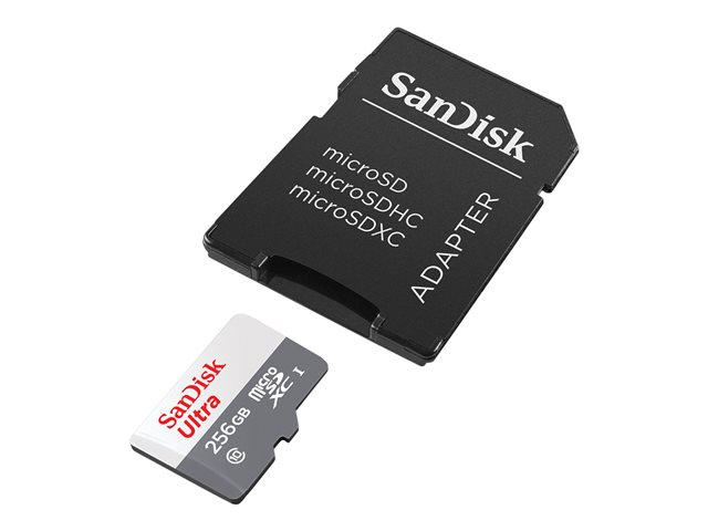 Produktbeskrivning SanDisk Ultra - flash-minneskort - 256 GB - mikroSDXC UHS-I Produkttyp Flash-minneskort Formfaktor mikroSDXC UHS-I minneskort Minneskapacitet 256 GB Hastighet Class 10 Minnesadapter som medföljer microSDXC till SD-adapter Tillverkarens garanti 7 års garanti -