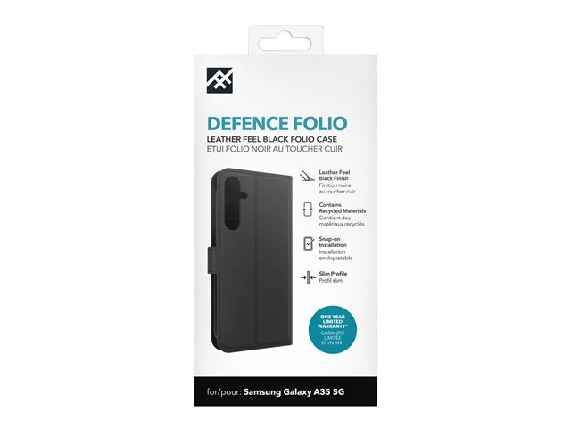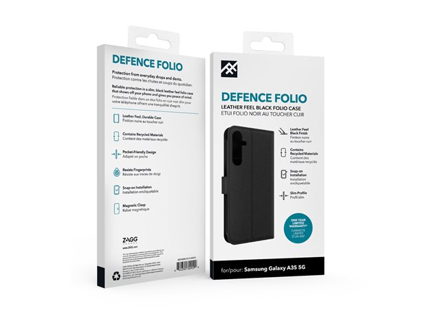 Produktbeskrivning iFrogz Defence - vikbart fodral för mobiltelefon Typ av produkt Vikbart fodral för mobiltelefon Material Läder Färg Svart Återvunnet produktinnehåll Tillverkas av återvunna material Tillverkarens garanti 1 års garanti Designat för Samsung Galaxy A35 -