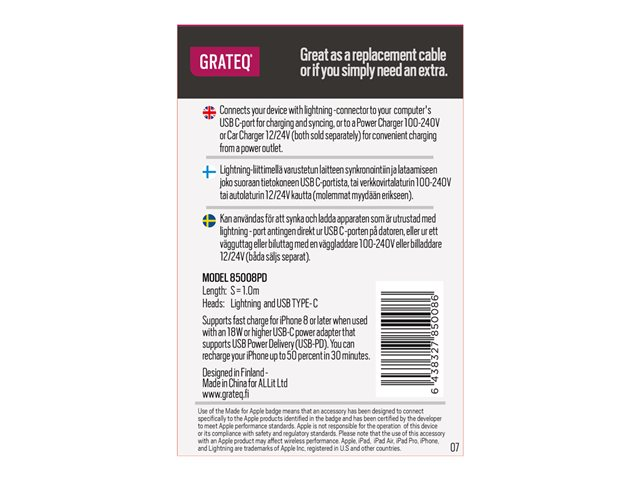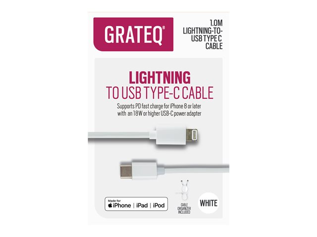 Produktbeskrivning GRATEQ Lightning-kabel - 1 m Kabel Lightning-kabel Längd 1 m Färg Vit Kontaktdon 24 pin USB-C - hane Kontakt (andra änden) Lightning - hane Egenskaper Strömförsörjningsstöd Tillverkarens garanti 6 månaders garanti -