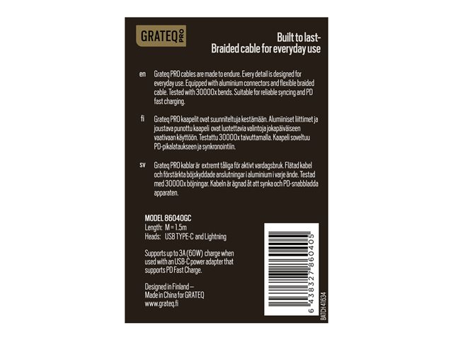 Produktbeskrivning GRATEQ PRO Lightning-kabel - Lightning / USB - 1.5 m Kabel Lightning-kabel - Lightning / USB Längd 1.5 m Färg Vit Kontaktdon 24 pin USB-C - hane Kontakt (andra änden) Lightning - hane Märkström 3 A Egenskaper USB Power Delivery (60W), flätad kabel -