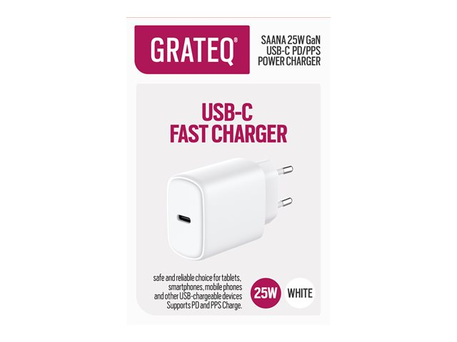 Produktbeskrivning GRATEQ SAANA strömadapter - GaN - USB-C - 25 Watt Typ av produkt Strömadapter Utformad för Mobiltelefon, surfplatta, smartklocka Färg Vit Typ av utkontakt USB-C Nätspänning AC 100-240 V (50/60 Hz) Max elektrisk ström 3 A Snabbladdningsteknik PD/PPS, Fast Charge Effekt 25 Watt Strömenhetsinformation - 24-stifts USB-C - 25 W Strömenhetens driftlägen PD (USB-C) - 15 W - 5 V - 3 A