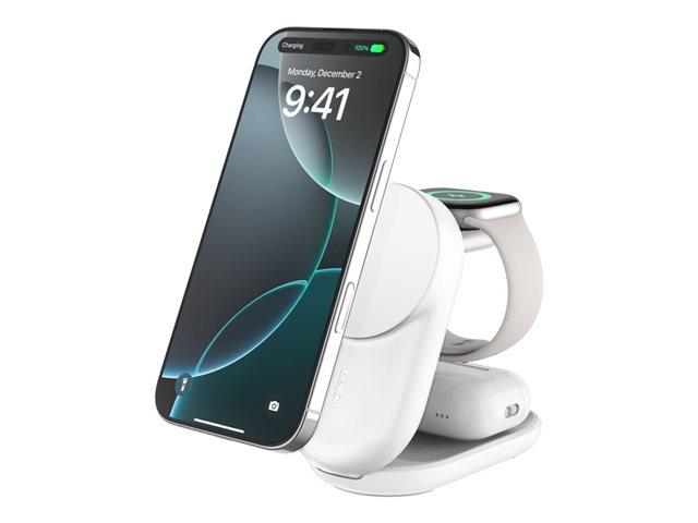 3-i-1, magnetisk, vikbar, med Qi2 + växelströmsadapter - 25 Watt - Fast Charge - vit