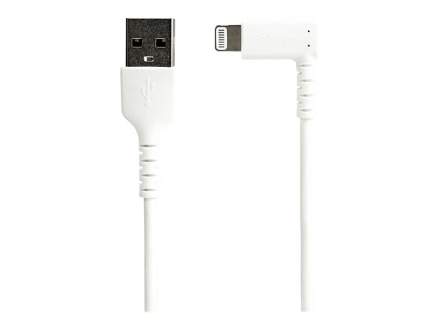 Produktbeskrivning StarTech.com 1m tålig USB-A till Blixtkabel - vitt 90° högervinkad, robust aramidfiber USB typ A till Blixtuppladdning/synkron sladd - Apple MFi-certifierad - iPhone - Lightning-kabel - Lightning / USB - 1 m Kabel Lightning-kabel - Lightning / USB Teknik Dubbelt skärmad Kabellängd 1 m Färg Vit Kontaktdon Lightning - hane - vinklad Kontakt (andra änden) USB - hane Egenskaper Synkronisering och laddning, klammer Tillverkarens garanti 2 års garanti -