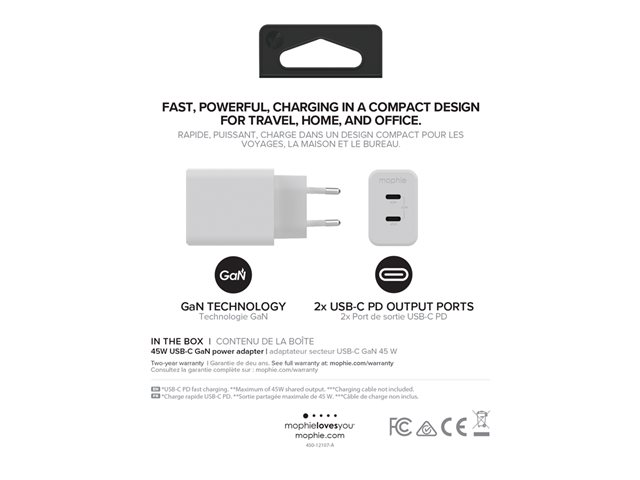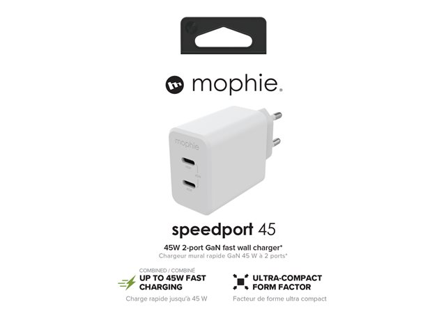 Produktbeskrivning mophie speedport 45 strömadapter - 24 pin USB-C - 45 Watt Typ av produkt Strömadapter Vikt 227 g Färg Vit Lokalisering Europa Typ av utkontakt Total 2: 24 pin USB-C Snabbladdningsteknik Fast Charge, Power Delivery Effekt 45 Watt Tillverkarens garanti 2 års garanti -