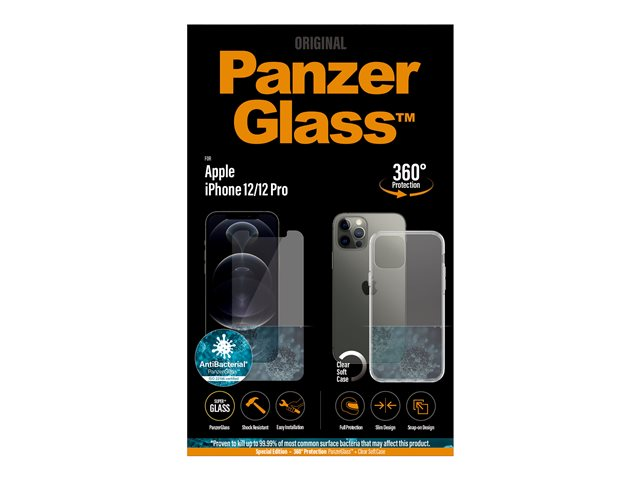 Produktbeskrivning PanzerGlass - skärm-/ryggskyddssats för mobiltelefon - 360° skydd Typ av produkt Skärm-/ryggskyddssats - glas Avsedd för Mobiltelefon Skydd Stötsäker, reptålig, antimikrobisk Förpacknings innehåll Skärmskydd, bakre skyddshölje Produktmaterial Härdat glas, termoplastisk polyuretan (TPU) Designat för Apple iPhone 12, 12 Pro -
