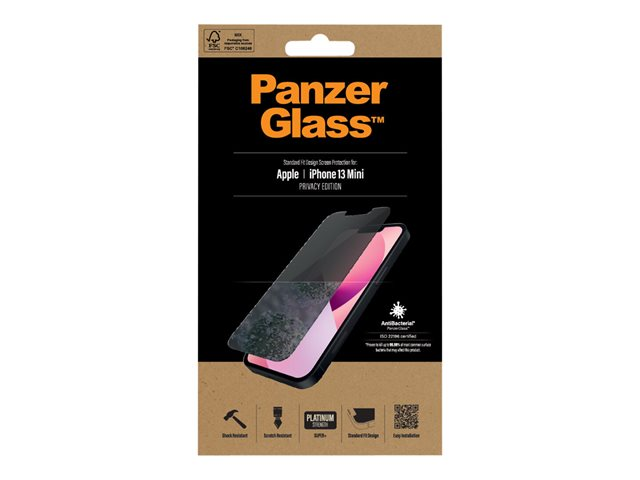 Produktbeskrivning PanzerGlass - skärmskydd för mobiltelefon Typ av produkt Skärmskydd - glas - med sekretessfilter Avsedd för Mobiltelefon Skydd Reptålig, antibakteriell, stötsäkert Beläggning Antimikrobiell Produktmaterial Härdat glas Tillverkarens garanti 30-dagars retur Designat för Apple iPhone 13 mini -