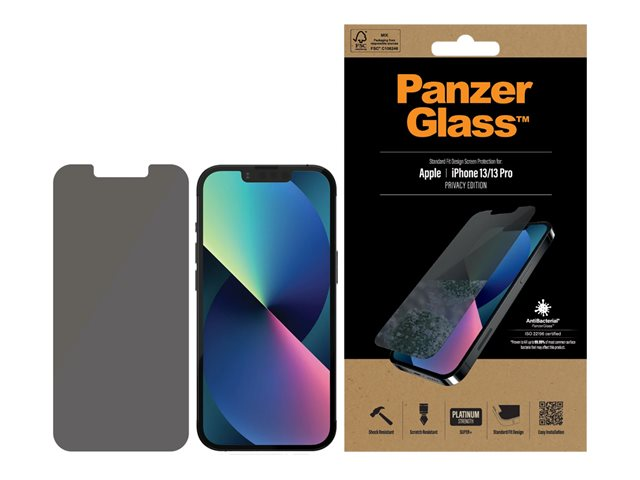 Produktbeskrivning PanzerGlass - skärmskydd för mobiltelefon Typ av produkt Skärmskydd - glas - med sekretessfilter Avsedd för Mobiltelefon Skydd Reptålig, antibakteriell, stötsäkert Beläggning Antimikrobiell Produktmaterial Härdat glas Tillverkarens garanti 30-dagars retur Designat för Apple iPhone 13, 13 Pro -