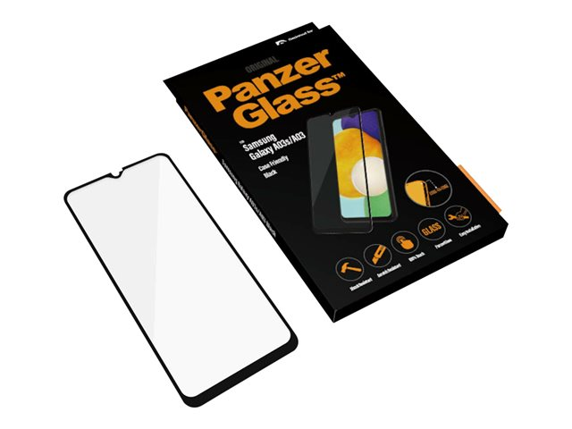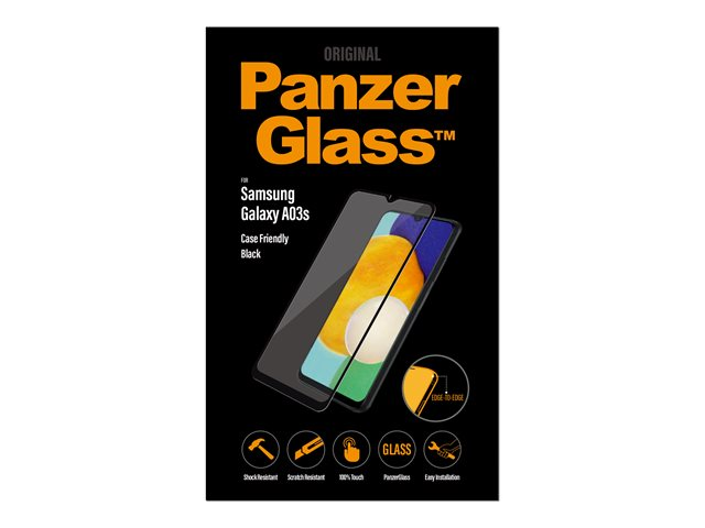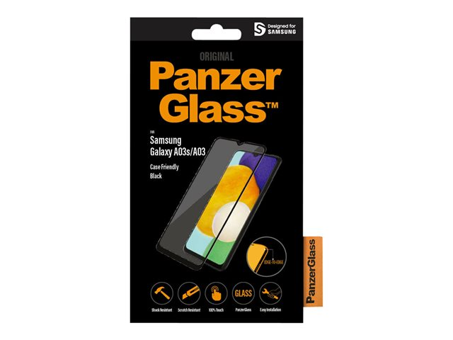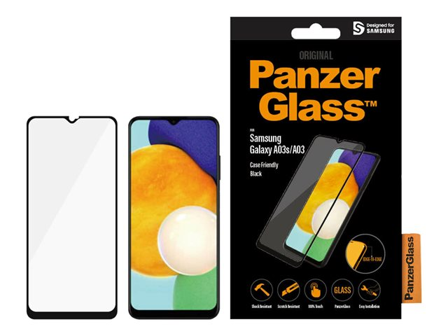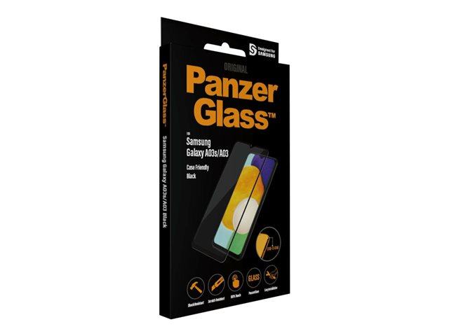 Produktbeskrivning PanzerGlass - skärmskydd för mobiltelefon Typ av produkt Skärmskydd - glas Avsedd för Mobiltelefon Skydd Reptålig, stötsäkert, fingeravtrycksresistent Beläggning Oleofob Produktmaterial Härdat glas Ramfärg Svart Designat för Samsung Galaxy A03s -
