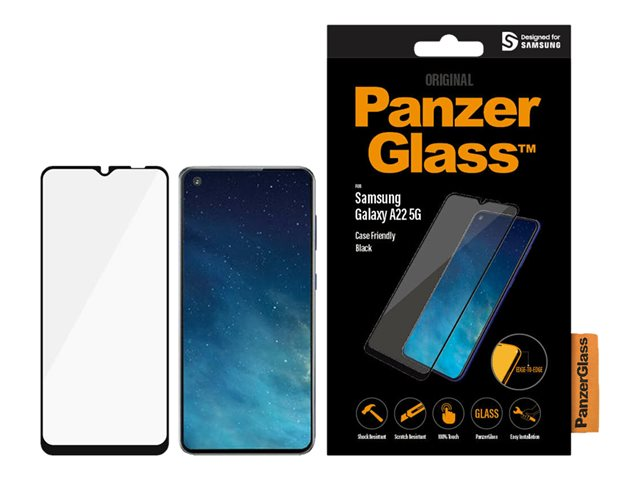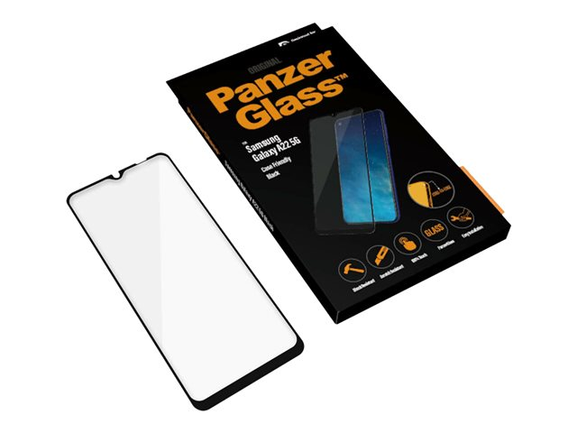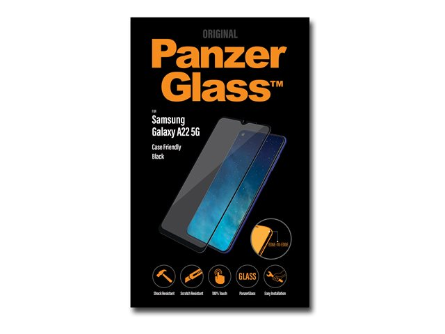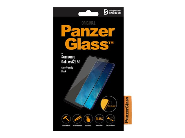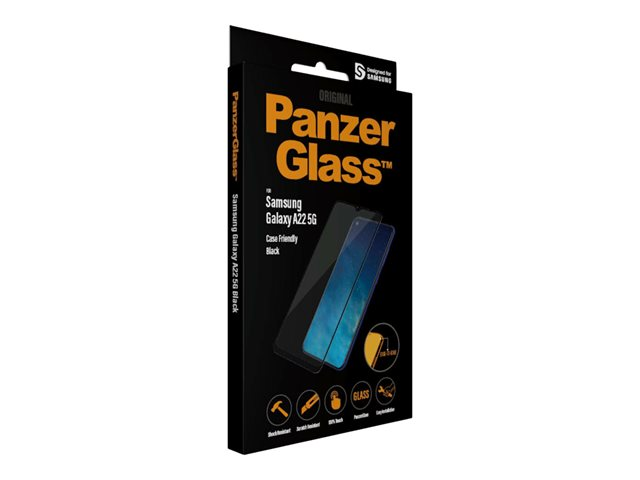 Produktbeskrivning PanzerGlass - skärmskydd för mobiltelefon Typ av produkt Skärmskydd - glas Avsedd för Mobiltelefon Skydd Reptålig, antibakteriell, stötsäkert, fingeravtrycksresistent Beläggning Antimikrobiell, oleofob Produktmaterial Härdat glas Ramfärg Svart Designat för Samsung Galaxy A22 5G -