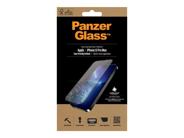Produktbeskrivning PanzerGlass - skärmskydd för mobiltelefon Typ av produkt Skärmskydd - glas Avsedd för Mobiltelefon Skydd Antibakteriell, stötsäkert, reptålig, fingeravtrycksresistent Beläggning Oleofob Produktmaterial Härdat glas Dimensioner (BxDxH) 7.445 cm x 15.7312 cm Grovlek 0.61 mm Vikt 23 g Ramfärg Svart Designat för Apple iPhone 13 Pro Max -