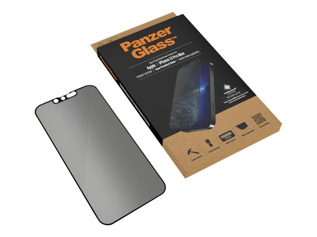 Produktbeskrivning PanzerGlass - skärmskydd för mobiltelefon Typ av produkt Skärmskydd - glas - med sekretessfilter Avsedd för Mobiltelefon Skydd Antibakteriell, reptålig, stötsäkert, fingeravtrycksresistent Beläggning Oleofob Produktmaterial Härdat glas Ramfärg Svart Designat för Apple iPhone 13 Pro Max -