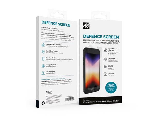 Produktbeskrivning ZAGG InvisibleShield Defense - skärmskydd för mobiltelefon Typ av produkt Skärmskydd - glas Avsedd för Mobiltelefon Produktmaterial Glas Designat för Apple iPhone 6, 6s, 7, 8, SE (andra generationen) -