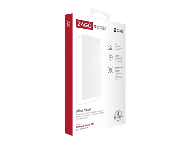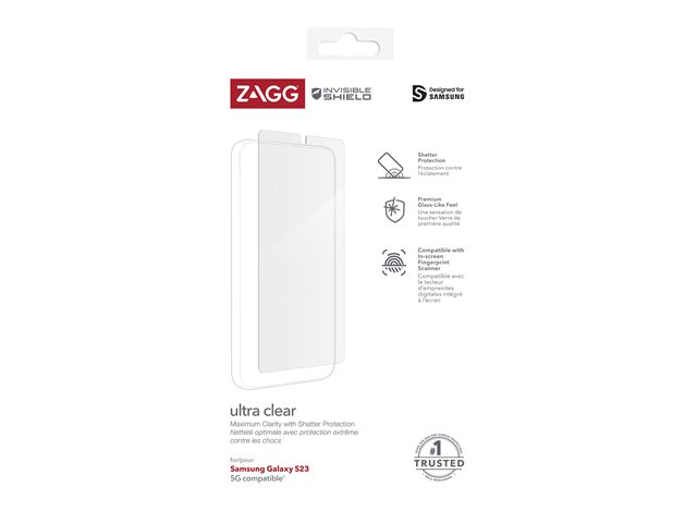 Produktbeskrivning ZAGG InvisibleShield Ultra Clear - skärmskydd för mobiltelefon Typ av produkt Skärmskydd Avsedd för Mobiltelefon Skydd Okrossbar, antimikrobisk, droppskydd, repskydd Beläggning Antimikrobiell Förpacknings innehåll Skärmskydd, avtorkare, rengöringstrasa, dammborttagningsmärke, EZ Apply-fack, mikrofiberduk Tillverkarens garanti Begränsad livstidsgaranti Designat för Samsung Galaxy S23 -