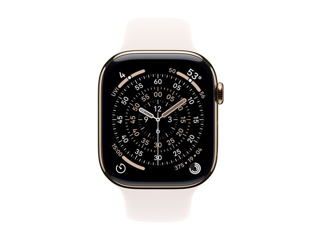 Produktbeskrivning Apple Watch Series 11 (GPS + Cellular) - guld titan - smart klocka med sportband - lätt rouge - 64 GB Produkttyp Smart klocka Tillverkarens modellnummer A3337 Aktivitet/sport Golf, löpning, simning, skidor, cykling, vandring, promenader, yoga, snowboarding, strength training, elliptisk, multisport, dans, trappgång, pilates, rullstol, intervallträning med hög intensitet (HIIT), utomhusrodd, paddling, roddmaskin, nedkylning, kernträning, tai chi, kickboxning Spårningsdata Distans, tid, brända kalorier, aktivitet, sovaktivitet, hjärtfrekvens, blodsyremättnad, sömnstadier, löptakt, ljudnivå, menstruell cykel, mätvärden för simning, ECG, träningslast, sömnkvalitetspoäng, ägglossningsfasen, steglängd, medvetenhet Anslutning LTE, Wi-Fi 4, UWB, Bluetooth 5G Navigering GPS/GLONASS/Galileo/BeiDou/QZSS-mottagare Bildskärm Retina LTPO3 OLED 416 x 496 pixlar - 326 ppi - safirglass - always-on display Processor Apple S10 Lagring 64 GB Operativsystem WatchOS Boett Rektangulär - 46 mm - 100% återvunnen titan Band Lätt rouge - sportband - fluoroelastomer - storlek: M/L - utbytbar Betalningsteknik Apple Pay Intelligent assistent Siri Inmatning Pekskärm, sidoknapp, roterande krona, dubbeltryck, handledsvridningsgest Passar handled med omkrets 160-210 mm Aviseringar Kalender, SMS, E-post, appar, hög och låg hjärtfrekvens, oregelbunden rytm, sömnapné-notifikationer, backtrack, hypertoni Funktioner Samtalshantering, Falldetektering, Nödläge SOS, medicinpåminnelse, sömnapnédetektering, hjärtfrekvenszoner, ljusstyrka: 2 000 nits, Stöd för familjeuppstart, Internationella nödsamtal, Kraschdetektering, brusövervakning, snabbladdning, kör träningsbygge, offline-kartor, roaming stöd Värdenhets-OS som stöds iOS Batteri Laddningsbart litiumjon Batteridriftstid Upp till 24 timmar Dimensioner (BxDxH) 39 mm x 9.7 mm x 46 mm Vikt 43.1 g Specifik absorptionshastighet (SAR) 0.97 W/kg (head)