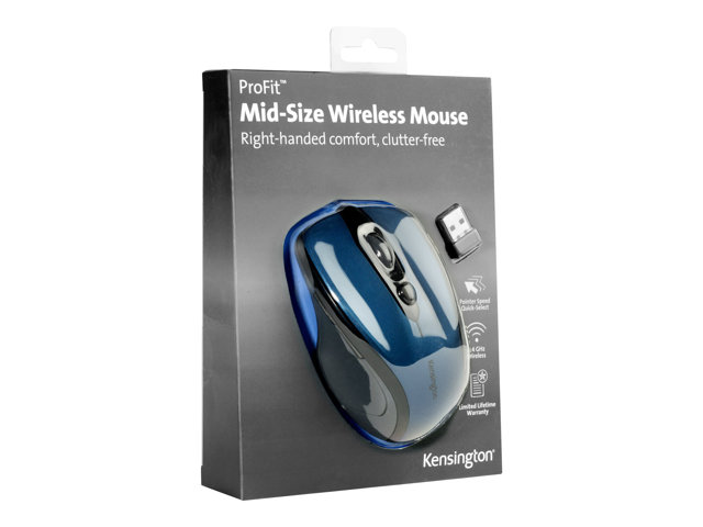 Produktbeskrivning Kensington Pro Fit Mid-Size - mus - 2.4 GHz - safirblå Typ av enhet Mus Anslutningsteknik Trådlös - 2.4 GHz Färg Safirblå Inriktning Högerhänt Trådlös mottagare Trådlös USB-mottagare Teknik för rörelsedetektering Optisk Rörelseupplösning 1750 dpi Egenskaper Scrollhjul, Nano-trådlös mottagare Batteri 2 x AAA-typ Tillverkarens garanti 2 års garanti -