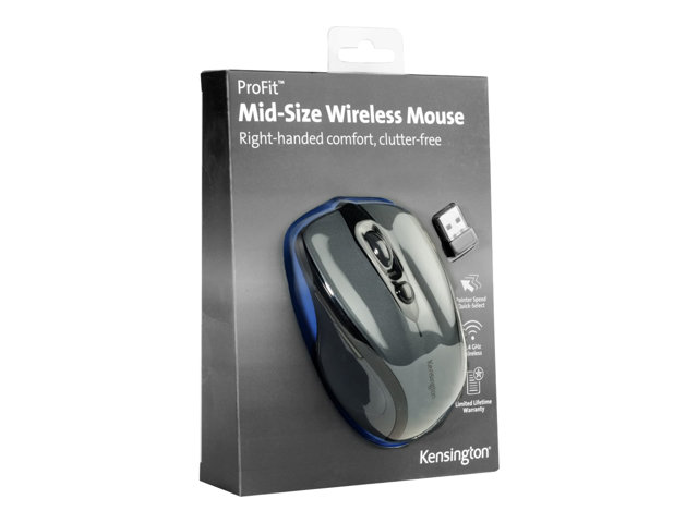 Produktbeskrivning Kensington Pro Fit Mid-Size - mus - 2.4 GHz - grafitgrå Typ av enhet Mus Anslutningsteknik Trådlös - 2.4 GHz Färg Grafitgrå Inriktning Högerhänt Dimensioner (BxDxH) 6.6 cm x 10.2 cm x 3.5 cm Vikt 110 g Trådlös mottagare Trådlös USB-mottagare Teknik för rörelsedetektering Optisk Antal knappar 5 Rörelseupplösning 1600 dpi Prestanda Realtidssensitivitetsomkoppling 800/1200/1600 dpi Egenskaper Scrollhjul, batteriindikator, på-/avströmbrytare, Nano-trådlös mottagare, uttag för trådlös mottagare, navigeringshjul, DPI-switch Batteri AAA-typ Operativsystem erfordras Apple OS X 10.8 Mountain Lion, Apple OS X 10.9 Mavericks, Microsoft Windows XP / Vista / 7 / 8 / 10, Apple MacOS X 10.11, Apple MacOS X 10.10 eller senare, Apple macOS Sierra 10.12, Google Chrome OS 44 eller senare, Apple MacOS 10.13 eller senare Tillverkarens garanti 2 års garanti -