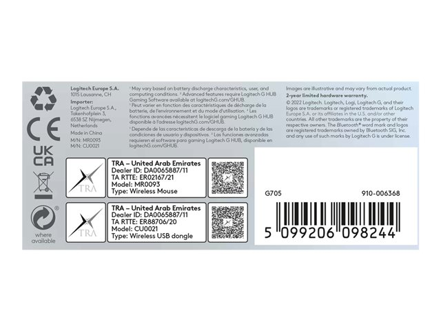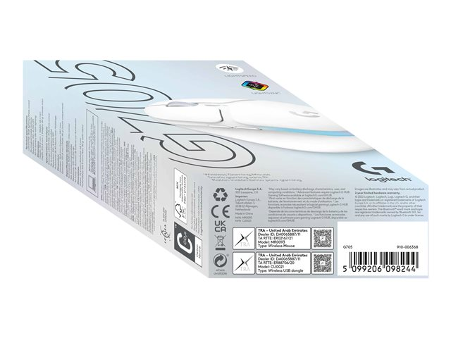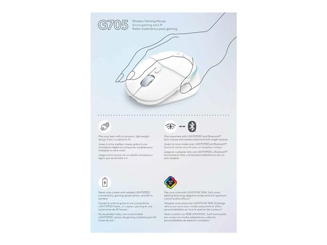 Produktbeskrivning Logitech G G705 - mus - små händer - Bluetooth - vit Typ av enhet Mus Anslutningsteknik Trådlös - Bluetooth Färg Vit Dimensioner (BxDxH) 6.81 cm x 10.58 cm x 3.94 cm Vikt 85 g Trådlös mottagare USB Logitech LIGHTSPEED-mottagare Antal knappar 6 Rörelseupplösning 8200 dpi Prestanda Sensitivitetsomkoppling i realtid 100 - 8 200 dpi Gaming Ja Egenskaper LIGHTSYNC-teknik, 6 programmerbara knappar, återuppladdningsbart batteri Operativsystem erfordras Windows 10 eller senare, Apple MacOS 10.15 eller senare, Apple iPadOS 13.4 eller senare, Apple iOS 14 eller senare Tillverkarens garanti 2 års garanti -