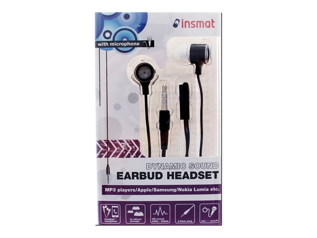 Produktbeskrivning Insmat - headset Typ av produkt Headset - kabelansluten Färg Svart Hörlursmodell Inuti örat Anslutningsteknik Kabelansluten Ljudutgångsläge Stereo Mikrofon På kabel Operativt läge för mikrofon Mono -