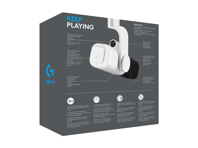 Produktbeskrivning Logitech G Yeti Studio - mikrofon Typ av produkt Mikrofon Rekommenderad användning Professionellt ljud - streaming, sändning, röst Gaming Ja Färg Vit Mikrofontyp Dynamisk med dubbla membran Operativt läge för mikrofon Superkardioid Brusreducerande mikrofon Ja Tillverkarens garanti 2 års garanti -