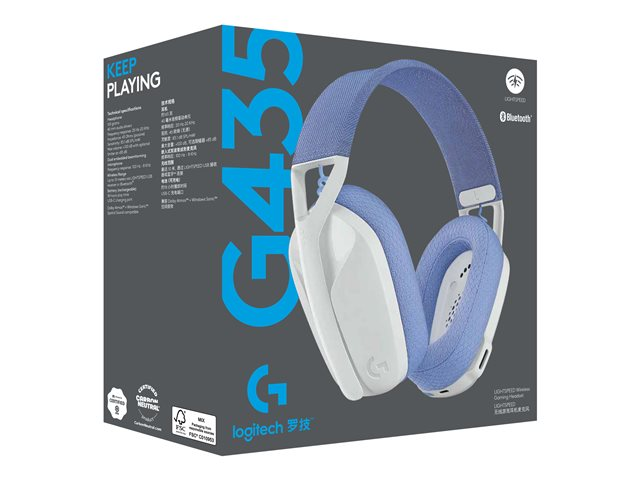 Produktbeskrivning Logitech Lightspeed G435 - headset Typ av produkt Headset - Bluetooth/radiofrekvens 2,4 GHz - trådlös Rekommenderad användning Spelkonsol, dator Färg Vit Hörlursmodell Fullstorlek Anslutningsteknik Trådlös Trådlös teknik Bluetooth/radiofrekvens 2,4 GHz Ljudeffekter Windows Sonic surroundljud Ljudspecifikationer Frekvensrespons 20 - 20000 Hz - Sensitivitet 83.1 dB/mW Impedans 45 ohm Operativt läge för mikrofon Strålformning Mjukvarucertifiering Discord-certifierad -